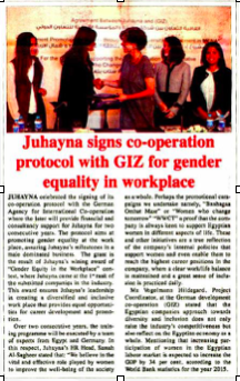 واستطردت الصغير ” نطمح من خلال هذه الشراكة المتميزة أن تصبح الشركة مثالاً يحتذى به في القطاع الصناعي مع الوصول للأهداف المرجوة والمتمثلة في خلق بيئة عمل متنوعة ومحفزة وتمنح جميع العاملين فرصاً للترقى وعلى وجه الخصوص للسيدات.” و ألمحت الصغير أن الاحصائيات الأخيرة أوضحت أن المرأة المصرية تمثل ثلث القوة العاملة بالسوق في حين يتقلد 7.1% منهم فقط مناصب إدارية في المؤسسات التي يعملون بها. وأكدت أن جهينه حريصة على توظيف المرأة وتمكينها حيث تبلغ نسبة الاناث 12%في المناصب القيادية آخذين في الاعتبار طبيعة المجال التصنيعي الذي تعمل به الشركة والذي يعد أنسب للذكور من الإناث. وتوقعت أن تزيد هذه النسبة في السنوات القادمة خاصة بعدما يؤتي برنامج GIZ ثماره.