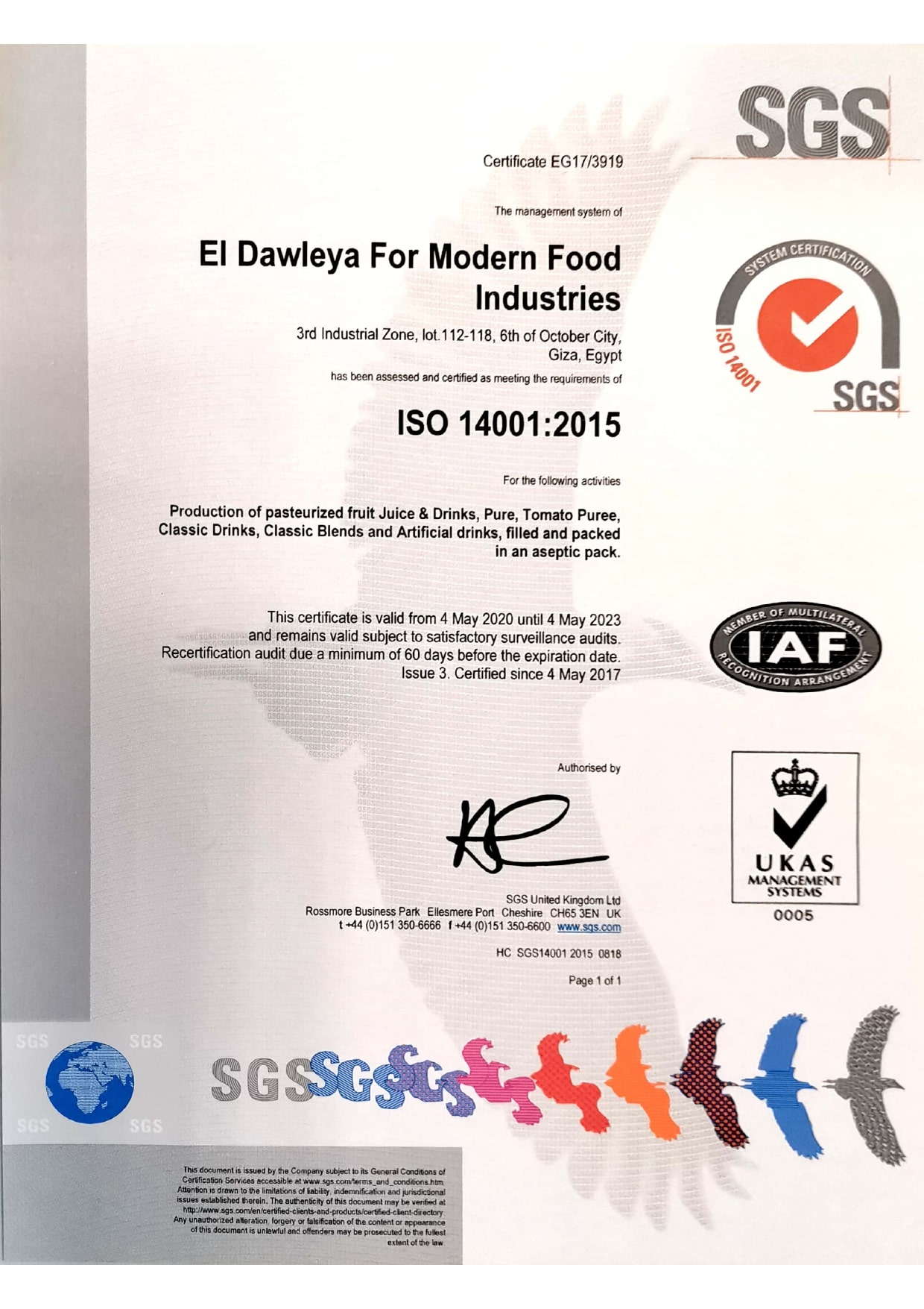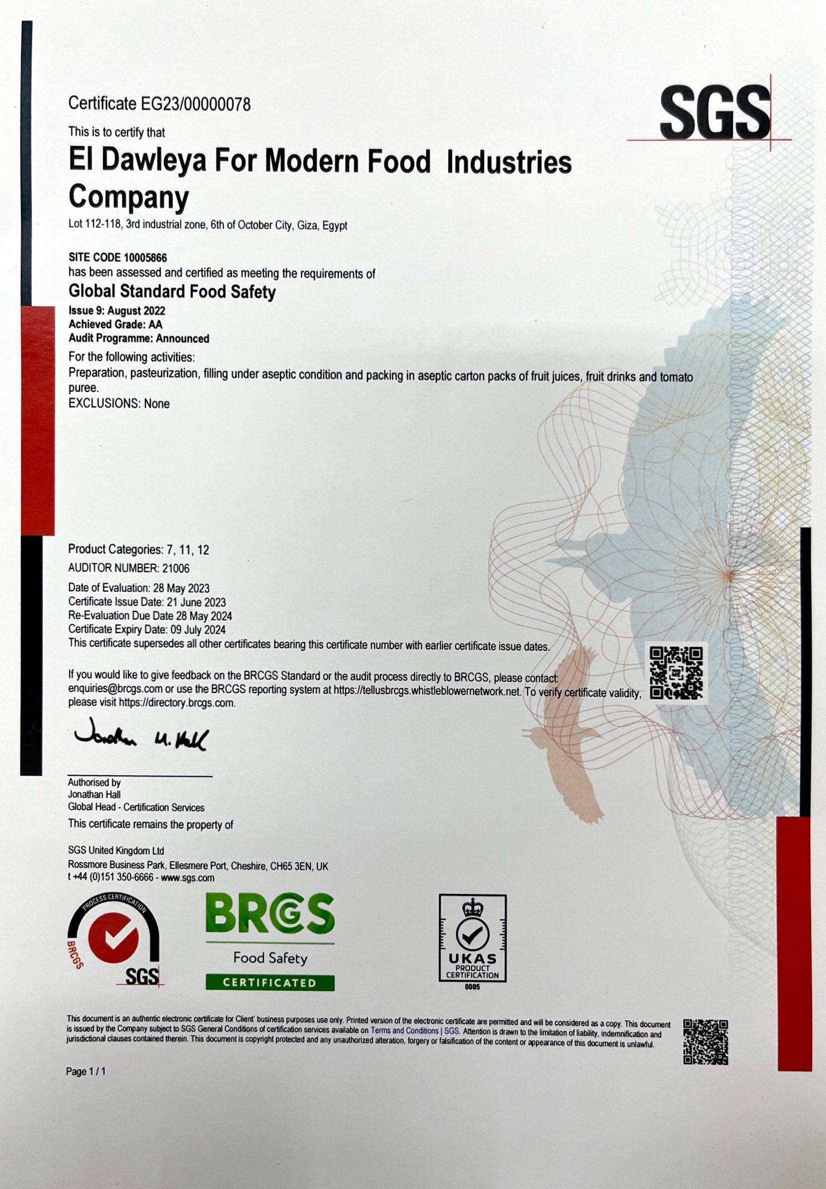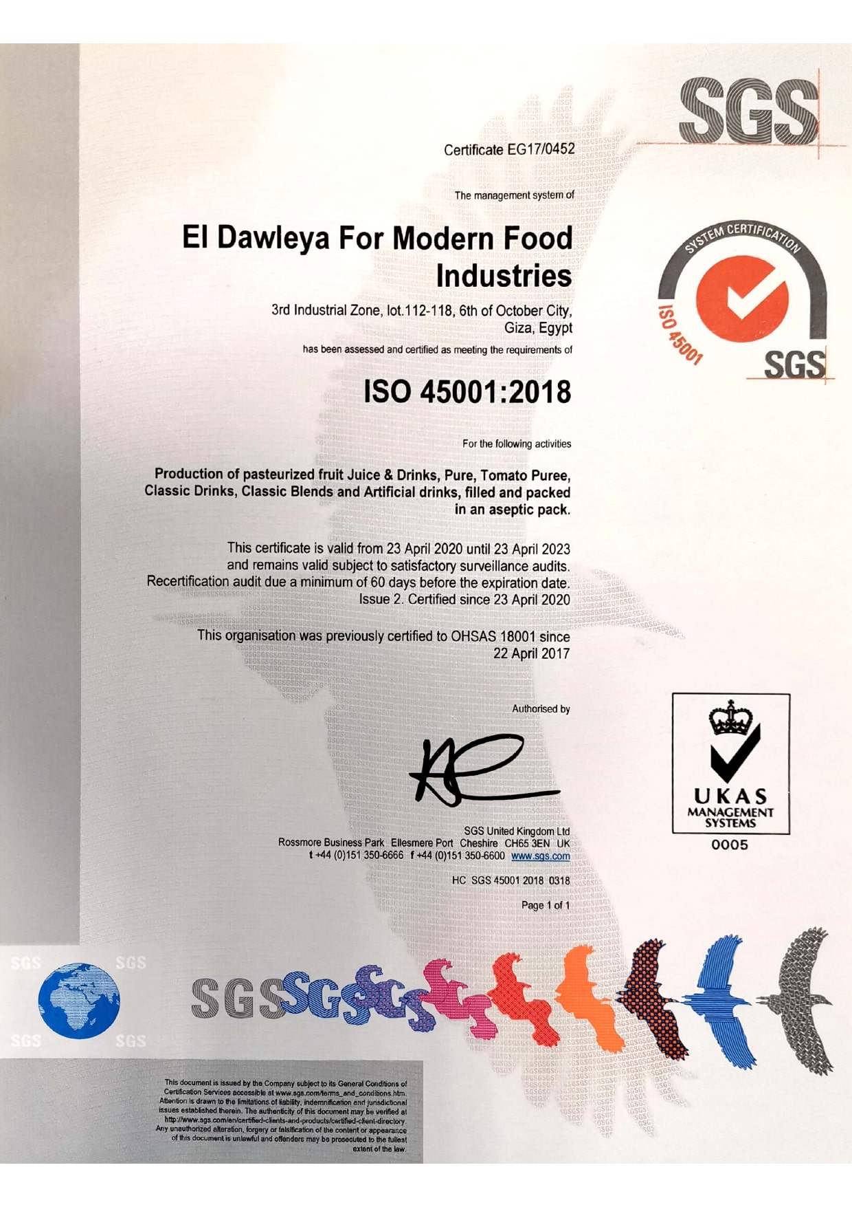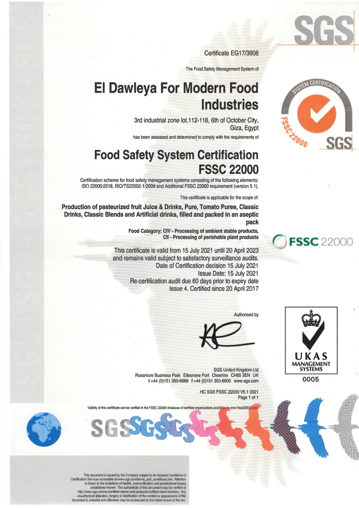 El Dawleya est l’un des plus grands complexes industriels d’Égypte et de la région MENA. Opérationnelle depuis 2009, cette usine phare est principalement dédiée à la production et au conditionnement de jus et de boissons fraîches, notamment Juhayna Juice, Pure, Bekhero et les boissons orientales. L’usine emploie 170 travailleurs, ingénieurs et membres du personnel administratif, qui travaillent sans relâche afin de garantir les meilleures performances d’El Dawleya. Entièrement automatisée, elle utilise les technologies les plus récentes et fonctionne avec un minimum de déchets. El Dawleya détient plusieurs certifications de qualité internationales et locales, notamment FSSC 22000, ISO 14001, ISO 45001, ISO 50001 et le Superior Taste Award.